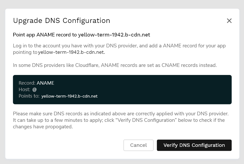 Follow the instructions in the modal. The steps to update the records might be slightly different depending on your domain name provider.