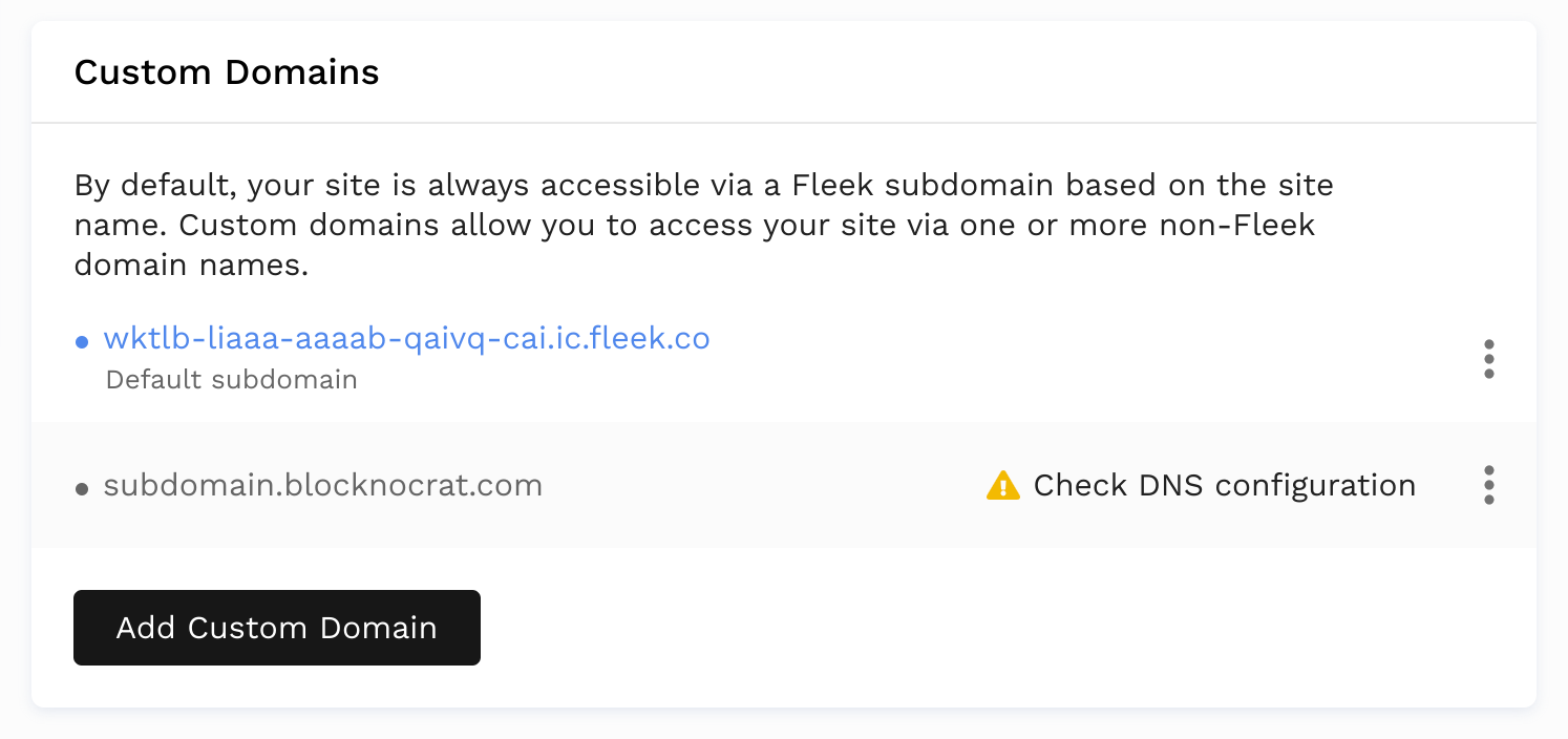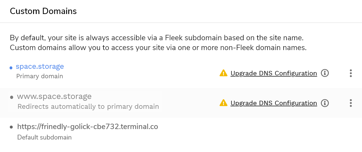 There, you will see the Custom Domains section, showing the Custom DNS Domain name you set up and connected to your Fleek site/app. Click on "Upgrade DNS Configuration" to re-configure your site.