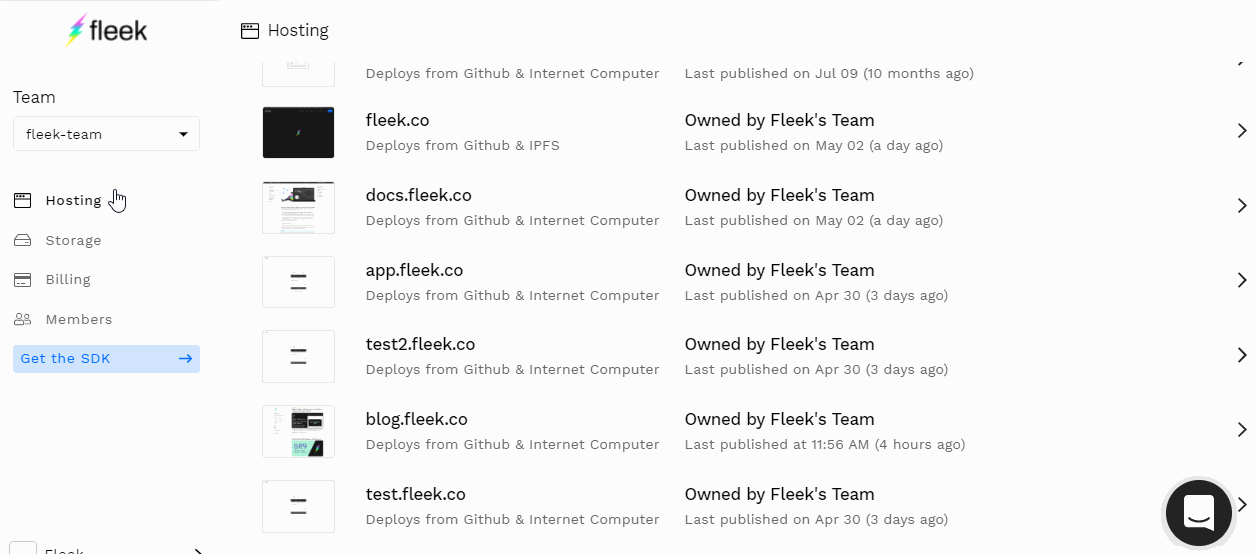 To migrate your site log into your Fleek account, and do this for every site that uses a custom DNS domain. Once you're logged in, visit the hosting tab, and click on a site on the list to get started.