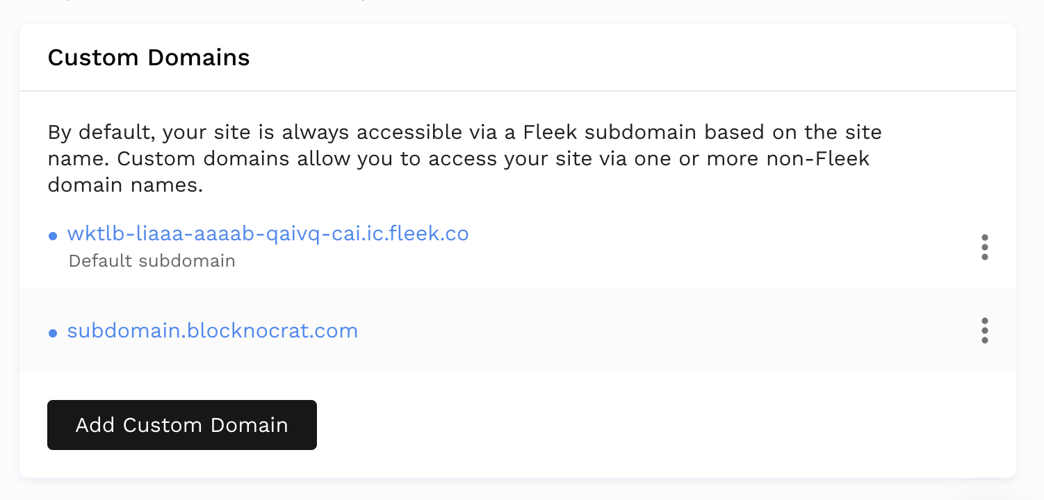 Upon site creation, Fleek will automatically assign a domain name depending on if your site is hosted on IPFS or the Internet Computer.