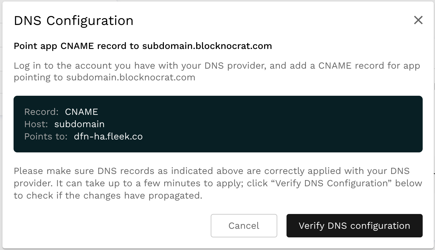 Once you have updated your records on your DNS provider, come back to Fleek to Verify the DNS Configuration once you do so.