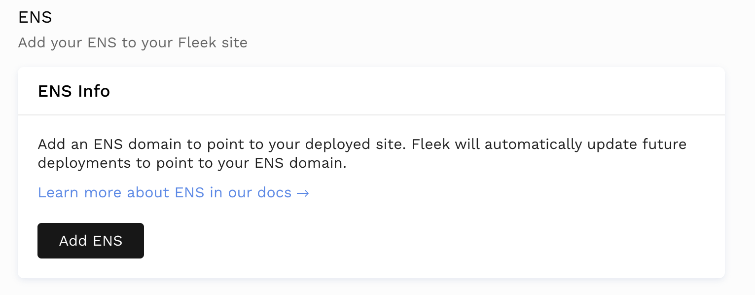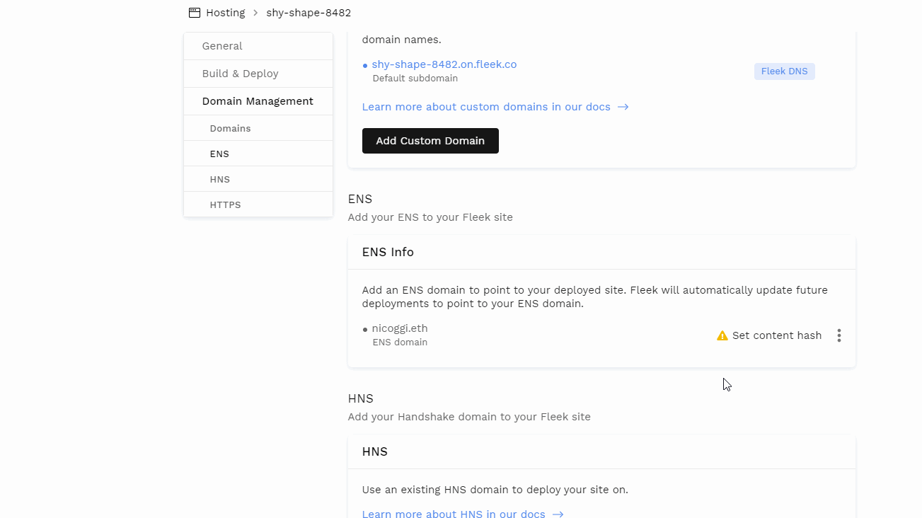 Once your app is deployed on Fleek, go to the settings page in the left-hand bar menu and click Domain Management. Scrolling a bit would land you on the section that says ENS