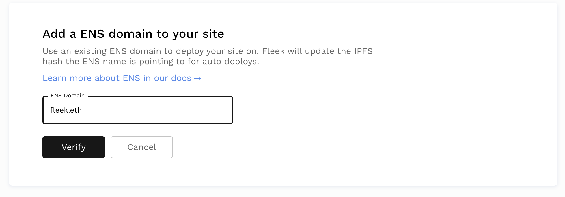 Upon confirmation the ENS domain will have been successfully added to Fleek.