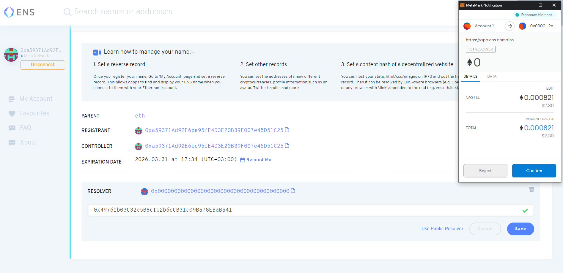 Hit SAVE and you will prompt a transaction on the ENS application that you will need to confirm with any compatible wallet, like MetaMask, paying the associated gas fee for the transaction that sets the record.