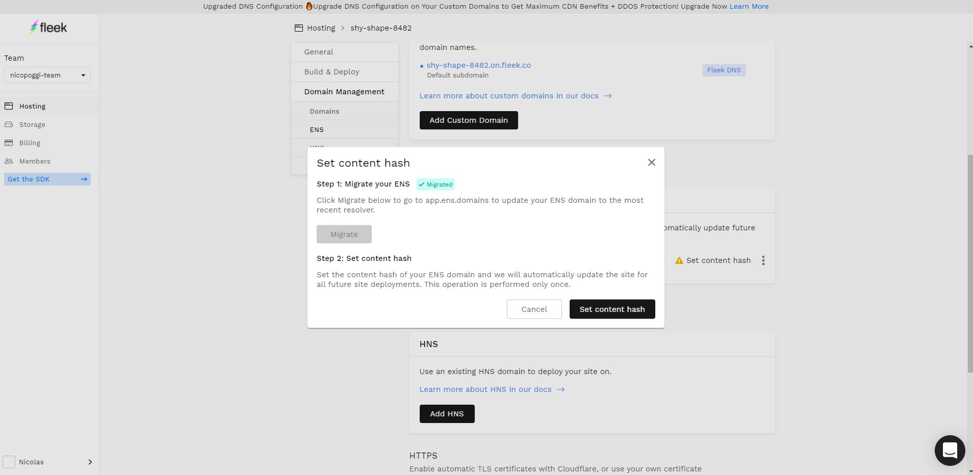 When the transaction is confirmed, go back to the Fleek application and your site's domain management page. You will see that if you reopen the 'SET CONTENT HASH' window, the migration will be registered and you can continue with the flow normally following the steps above.