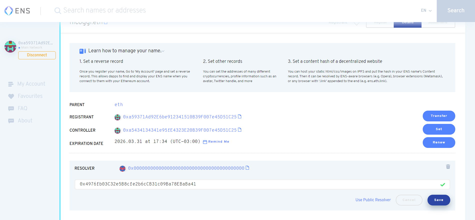 In the RESOLVER section, click the SET button to open up the window that will help you reconfigure your ENS domain resolver. Click the 'USE PUBLIC RESOLVER' option to have ENS auto-fill with a public, up-to-date, resolver. Alternatively, you can use a custom one if you now the proper address.