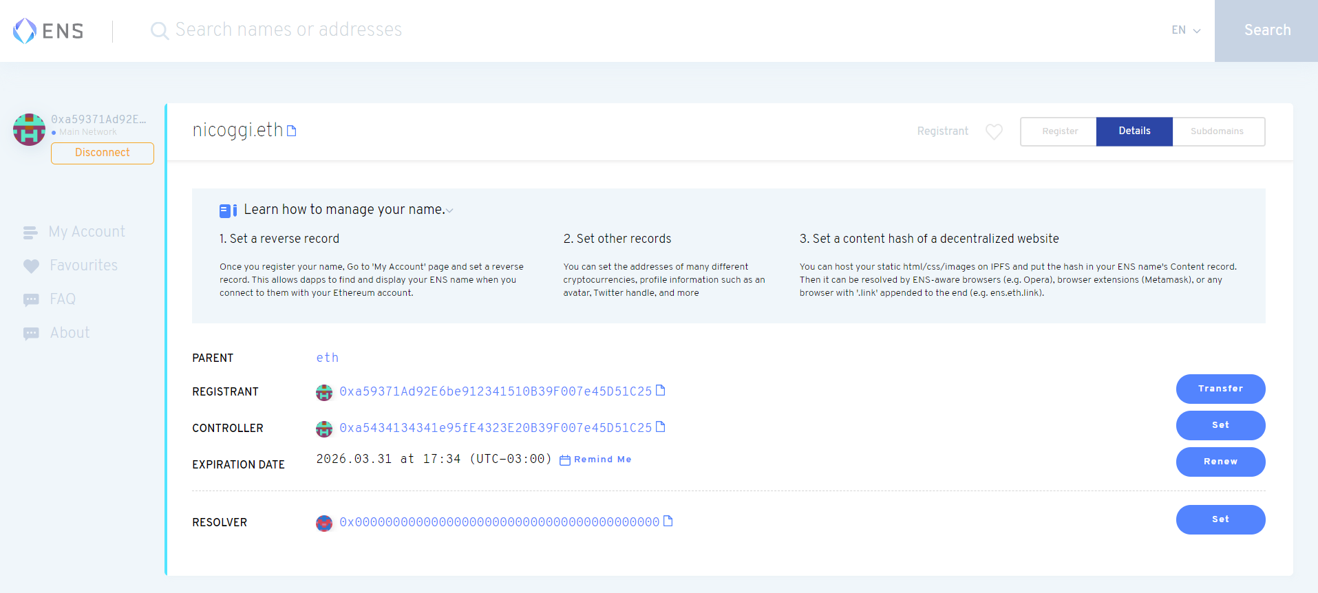 To migrate your domain: Click the Migrate button on the window seen above and the Ethereum Name Service Application will open, on your domain's details page.