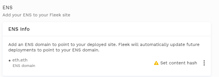 Once you add your first ENS domain, you will need to SET THE CONTENT hash. This means you will set the IPNS address that references your site on Fleek, and that Fleek will update periodically upon each deployment to keep your sites' content up to date. Click set content hash to begin the process